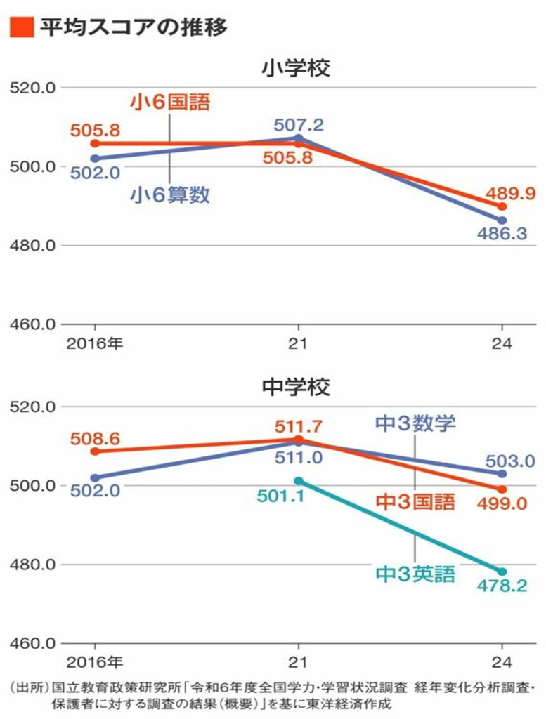 先ごろ、東洋経済オンラインに、上記のグラフとともに、「学力低下」の原因は「小学校での探求やグループワークの増加」にあるとする文章が掲載されました。