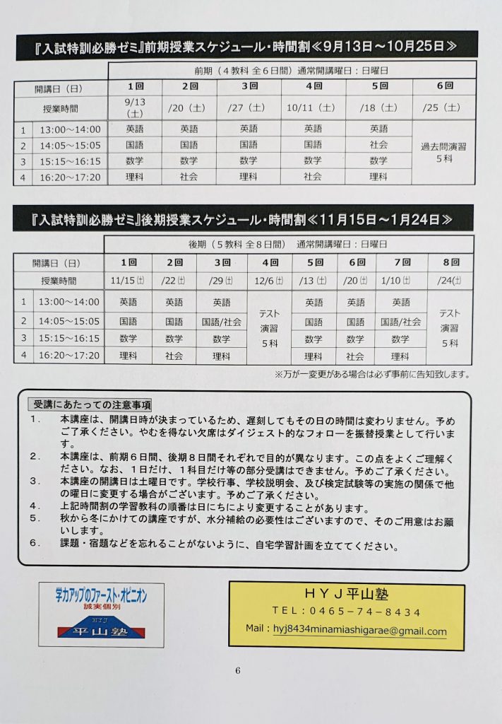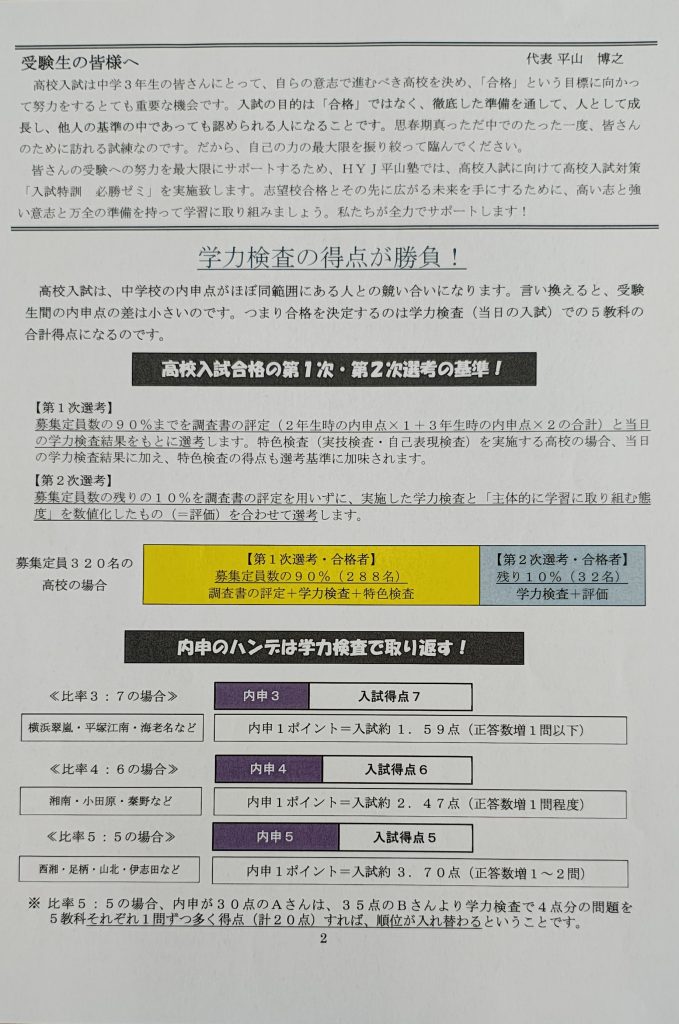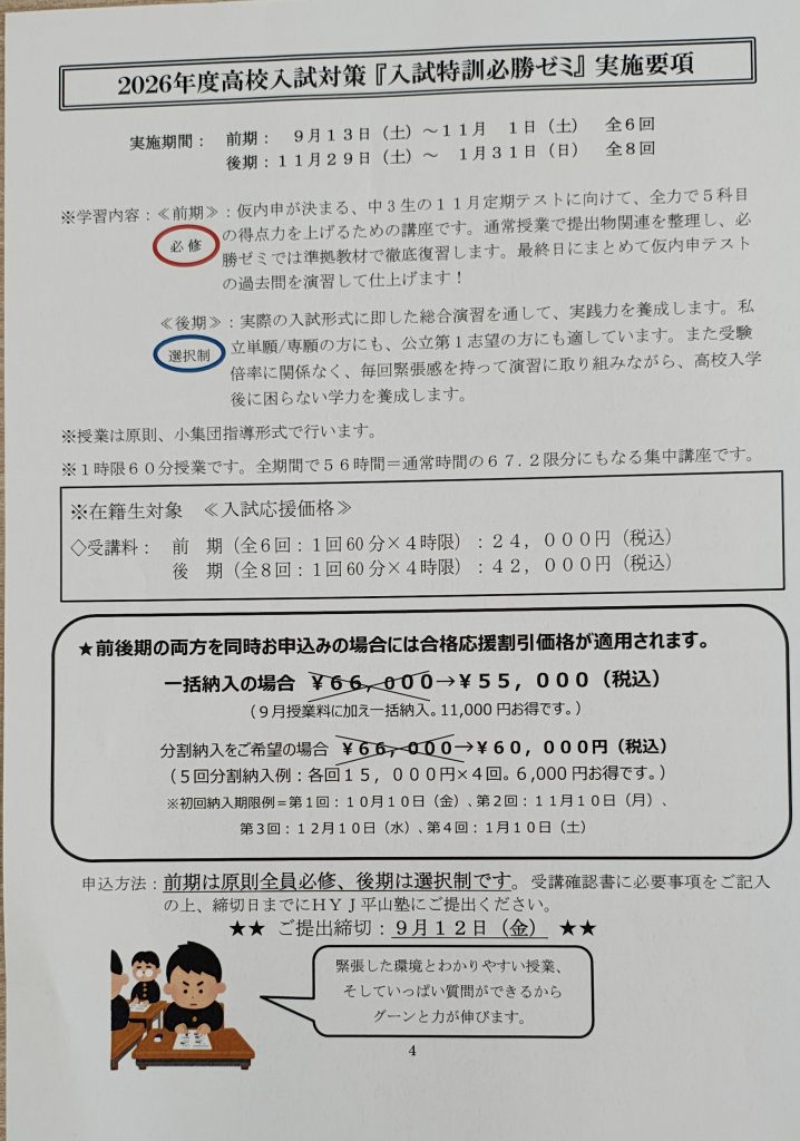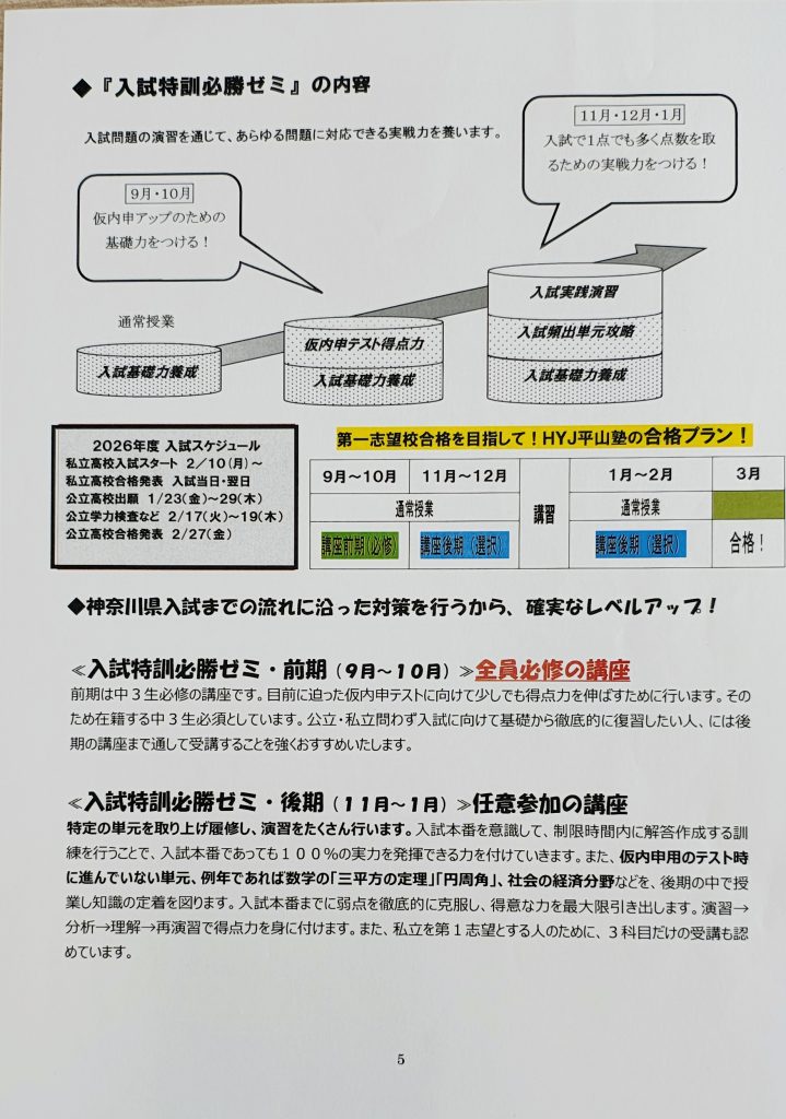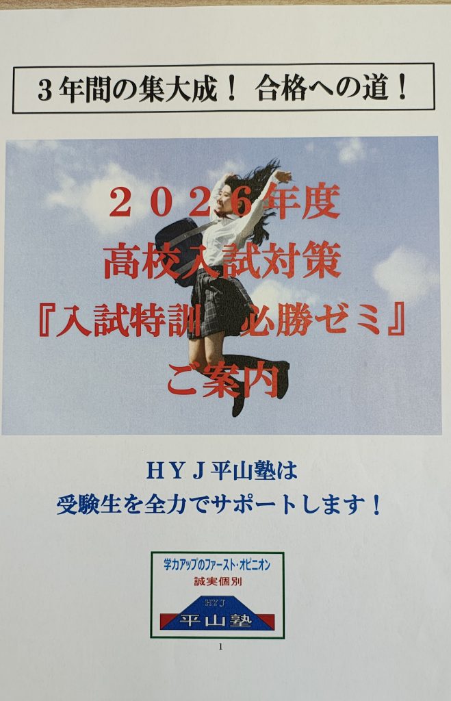 皆さんの受験への努力を最大限にサポートするため、HYJ平山塾では、高校入試に向けて高校入試対策「入試特訓 必勝ゼミ」を実施致します。志望校合格とその先に広がる未来を手にするために、高い志と強い意志と万全の準備を持って学習に取り組みましょう。私たちが全力でサポートします!