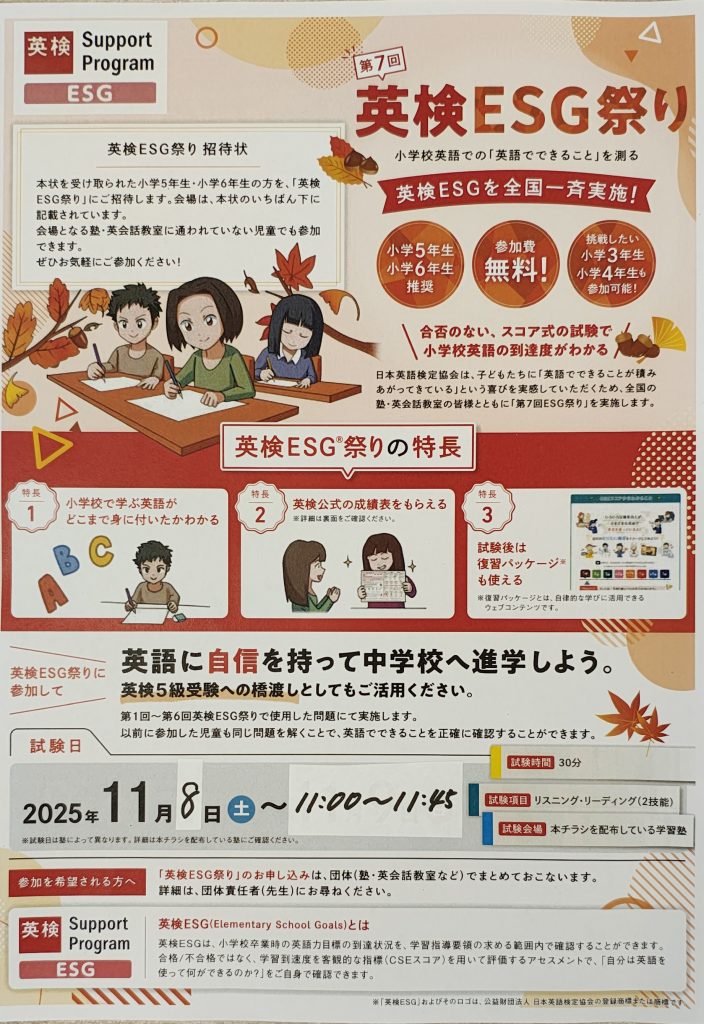 只今英検ESG祭り受付中‼(お申込期間:11/7まで)